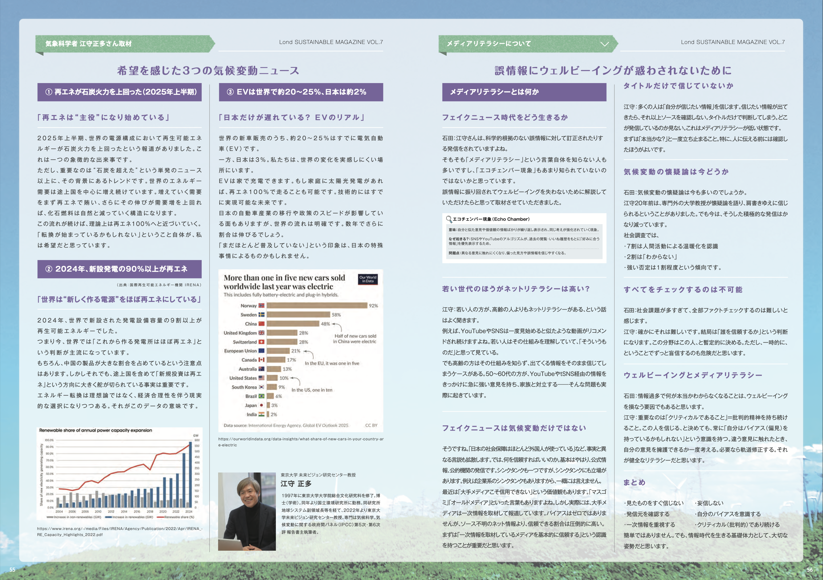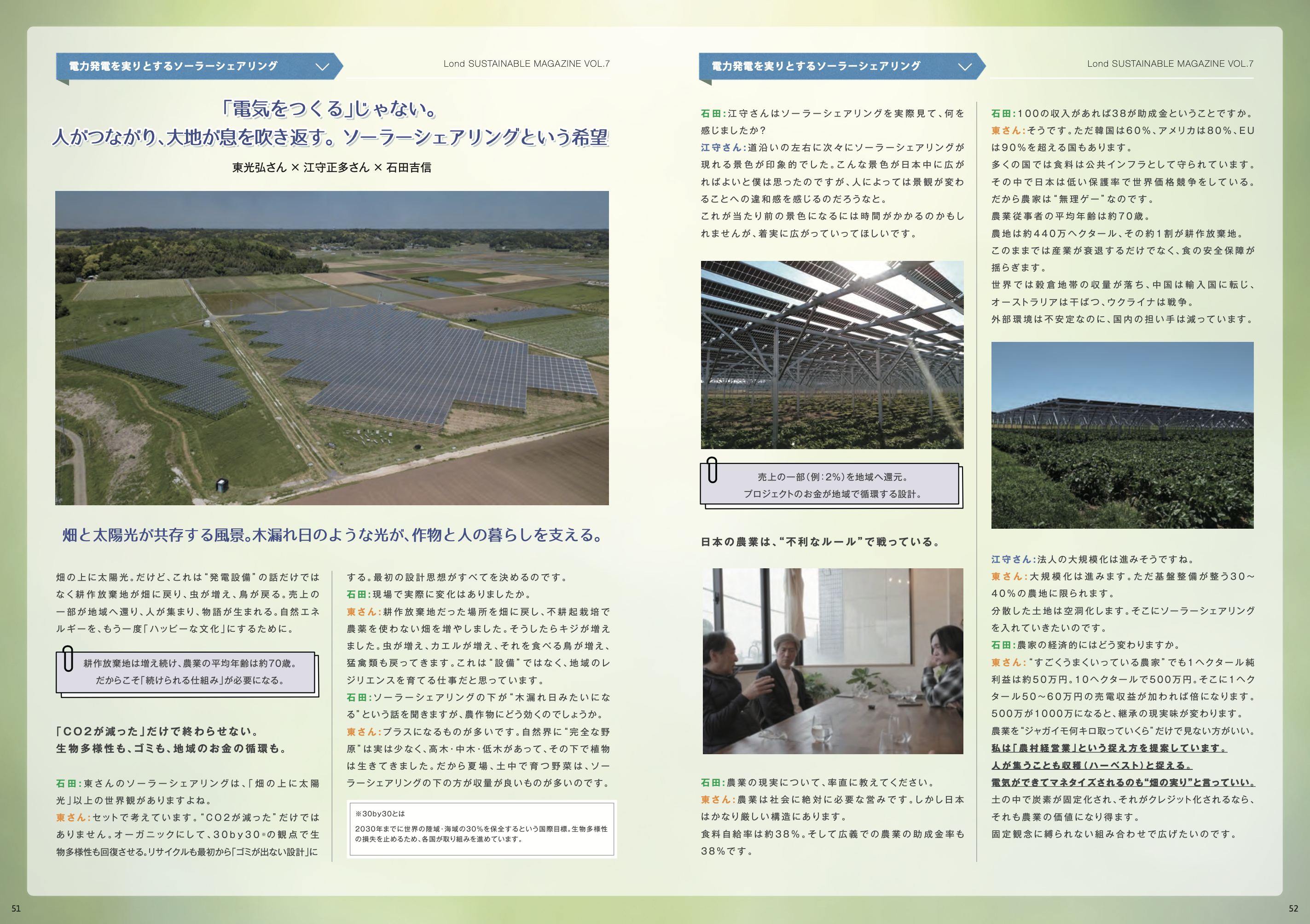 市民エネルギーちば株式会社/株式会社TERRA代表取締役 東光弘氏、東京大学 未来ビジョン研究センター教授 江守正多氏、株式会社Lond Holdings 代表 石田吉信による対談を掲載し、